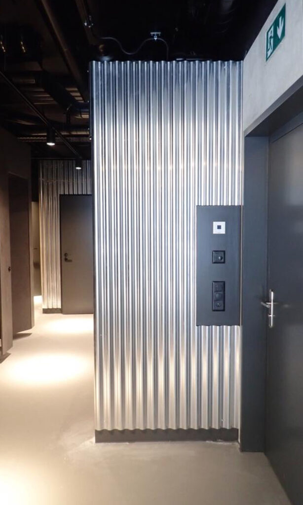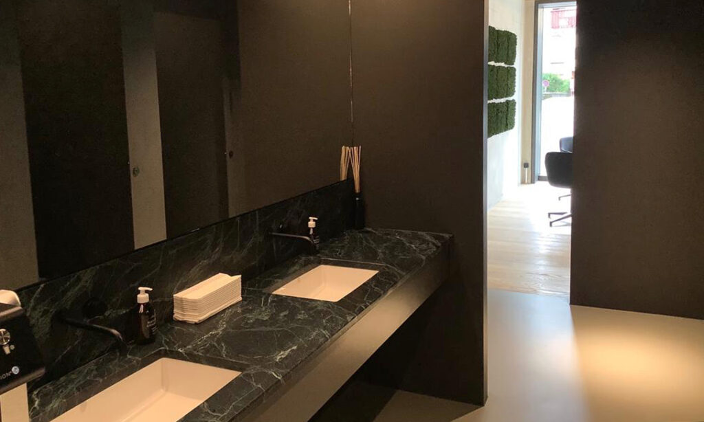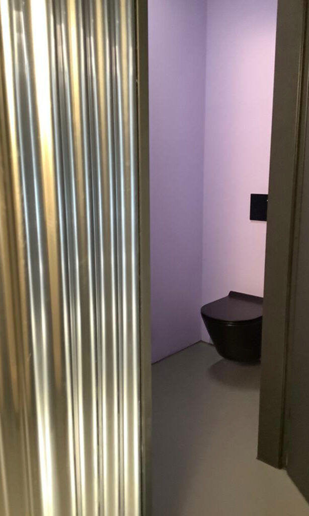 Im Nasszellenblock mit Umkleiden herrscht eine dramatisch-intime Atmosphäre. Nach dem Training erfährt der Kunde eine weitere Aufwertung seines Trainingserlebnis und verlässt entspannt das Studio.