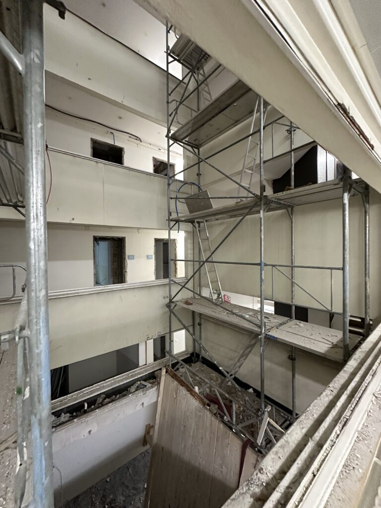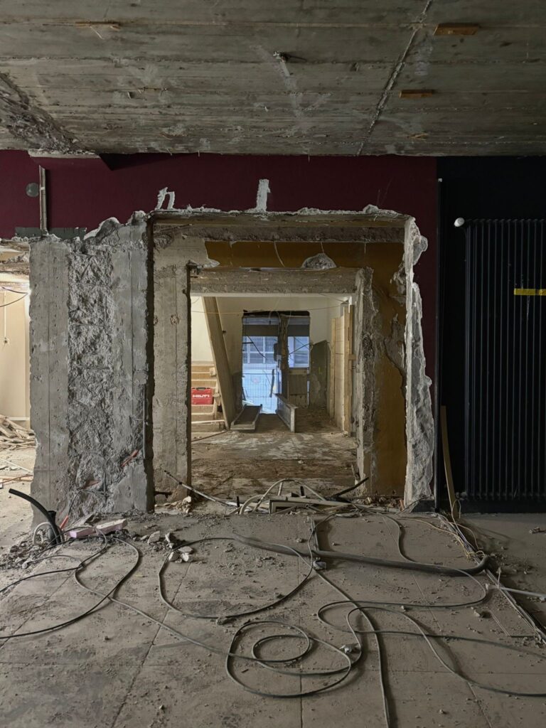 Unser Farb- und Materialkonzept wurzelt bewusst in dieser historischen Substanz. Die markanten Rotnuancen der Fassade finden ihren Weg nach innen und bilden den ersten Schritt einer behutsamen gestalterischen Transformation. Hochwertige Wandfliesen greifen den ursprünglichen Farbton auf, interpretieren ihn jedoch mit feinen Variationen, die Frische und Modernität einbringen. So entsteht ein fließender Übergang von außen nach innen – respektvoll im Umgang mit dem Bestehenden und gleichzeitig offen für Neues. Im weiteren Raumverlauf erweitern harmonische Blau- und Grüntöne die Atmosphäre. Sie verankern das Projekt noch stärker in Zürich, der Heimat des Gründers Fred Tschanz, und entfalten sich zunehmend, bis sie in der Gestaltung der Bettrückwände ihren Höhepunkt finden – erneut in Form sorgfältig gesetzter Fliesen. Noch steckt alles mitten im Bau, aber die Vorfreude ist groß: Schritt für Schritt entsteht ein Ort, der Historie und Gegenwart zu einem selbstverständlichen Dialog verbindet – und damit etwas schafft, das sich vertraut anfühlt und gleichzeitig mutig nach vorne blickt.