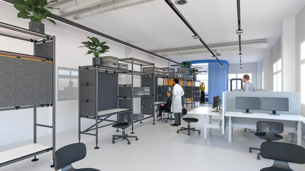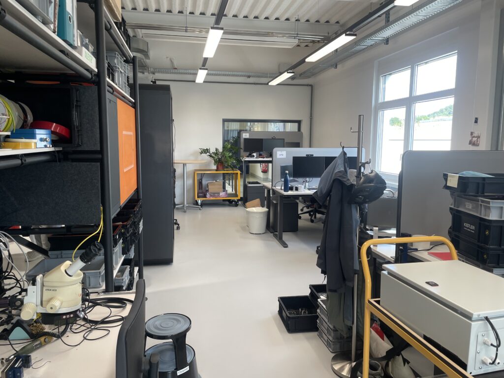 Auf dieser Basis entstand ein Zonenkonzept, das fokussierte Entwicklung, Austausch, Prototyping und informelle Begegnungen klar strukturiert und dennoch maximale Flexibilität zulässt. Anschliessend erarbeiteten wir das detaillierte Design samt Kostenrahmen. Für die Umsetzung arbeiteten wir mit dem Kistler-Partnerarchitekten zusammen, der den Bau und die Arbeiten vor Ort verantwortete, während wir Planung und Gestaltung bis zur Ausführung begleiteten.