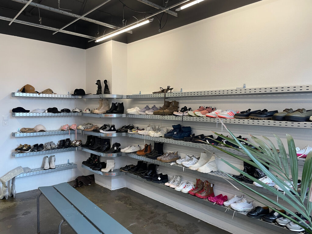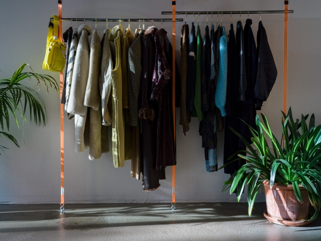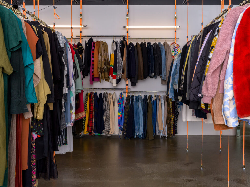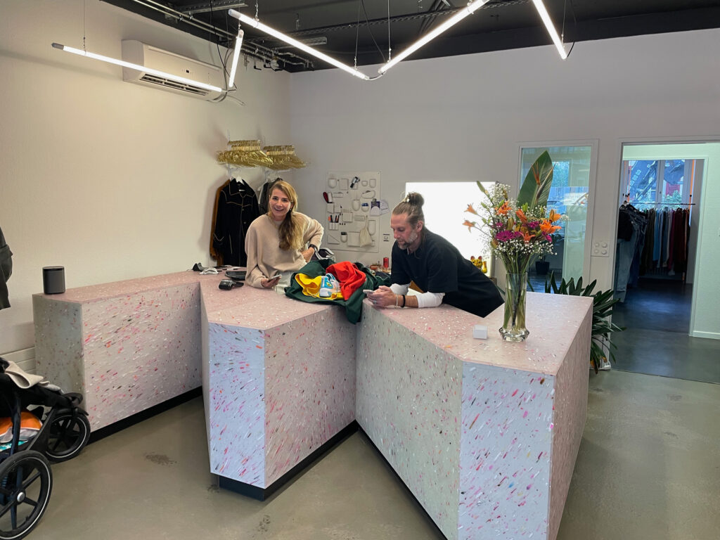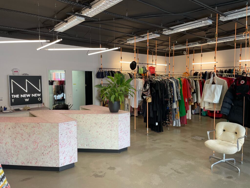 The New New ist ein Gebrauchtkleiderladen mit einfachem, aber effektivem Konzept: Cash auf die Kralle für deine alten Kleider. Das hat am ersten Standort so gut funktioniert, dass auch ein zweiter her musste. Mit Spanngurten und etwas Erfindergeist können die Kleiderstangen frei in jeder Höhe montiert werden. Die Logotheke, die dank der grossen Abwicklung viel Platz für Interaktion bietet, haben wir mit Recycling-Plastik beplankt (unter anderem aus geschmolzenen Kühlschränken) und das Schuhgestell besteht aus Kabeltrassen. Die Beleuchtung aus handelsüblichen LED-Röhren ist in die Zurrgurte integriert.